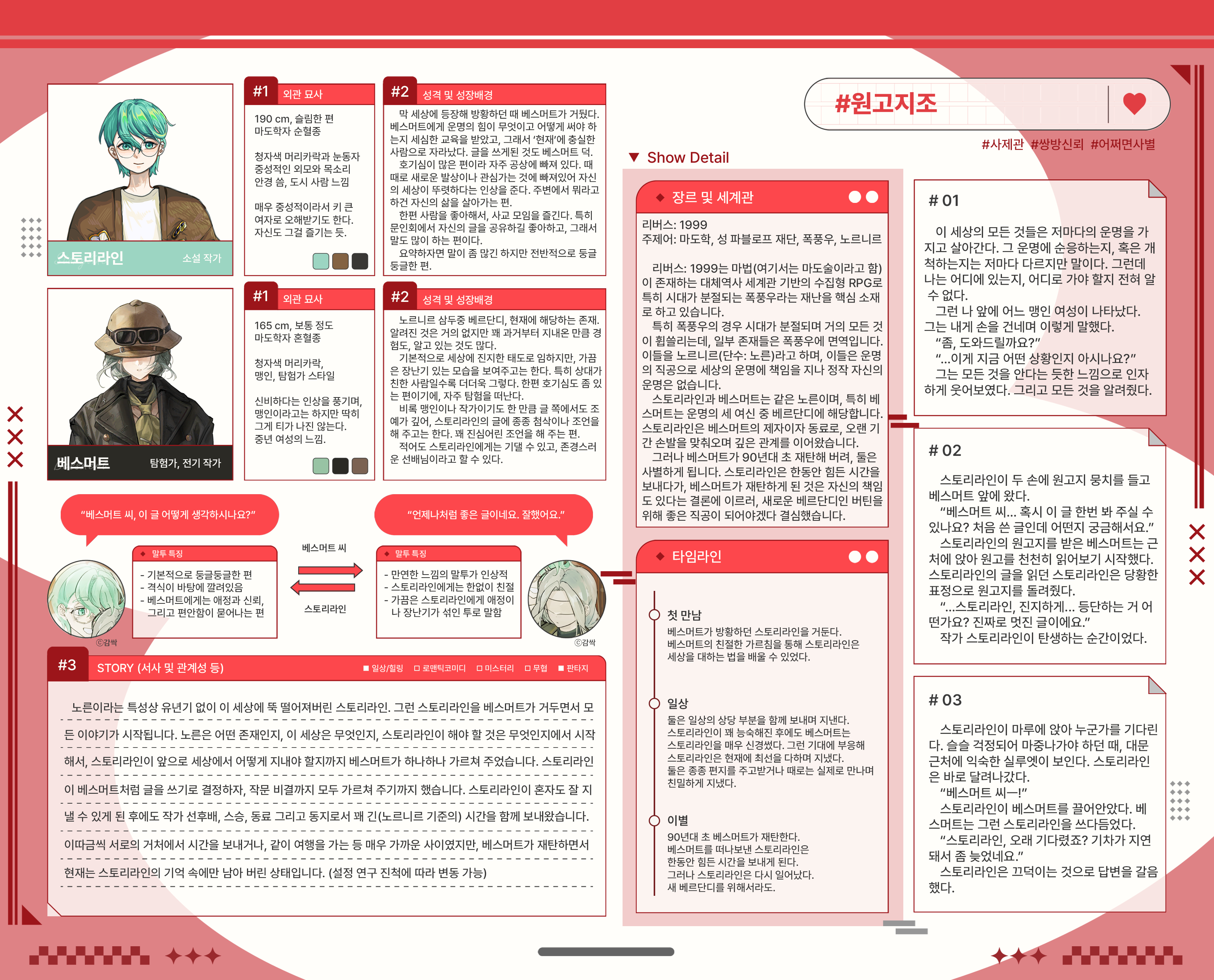 모든 존재에게는 처음이 있습니다. 시대에서 부유하는, 다른 세상의 존재처럼 느껴지는 직공들에게도 적용되는 사실이기도 합니다. 스토리라인(엄밀히 말해 탄생 시점에는 이 명의가 없었지만)도 마찬가지로, 어느 시점에 갑자기 노른으로써 이 세상에 나타났습니다. 직공이기에 유년기는 없었고, 스스로 직공이라는 자각을 가진 채로 탄생했습니다. 그러나 아는 것이 전혀 없어, 어떻게 해야 할지 전혀 모르는 채로 자립하는 데 애를 먹고는 했습니다.¹